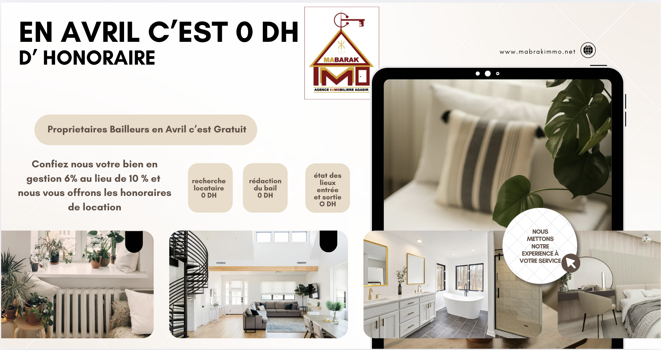 Propriétaires à Agadir, c’est le moment de souffler ! Chez MABARAK, on a décidé de fêter le printemps avec une offre jamais vue. Vous nous confiez votre bien en avril ? On s’occupe de TOUT, et pour vous... c’est 0 DH d'honoraires ! 💸✨